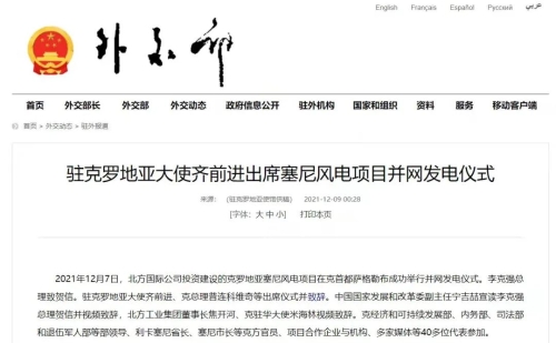 2021年12月7日,中國(guó)兵器工業(yè)集團(tuán)有限公司北方公司所屬北方國(guó)際投資、建設(shè)和運(yùn)營(yíng)的塞尼156MW風(fēng)電項(xiàng)目在克羅地亞首都薩格勒布隆重舉行并網(wǎng)發(fā)電儀式。李克強(qiáng)總理致賀信。克羅地亞總理安德烈·普連科維奇,中國(guó)駐克羅地亞大使齊前進(jìn)出席儀式并致辭。中國(guó)國(guó)家發(fā)展和改革委員會(huì)副主任寧吉喆宣讀李克強(qiáng)總理賀信并視頻致辭,中國(guó)兵器工業(yè)集團(tuán)有限公司董事長(zhǎng)焦開(kāi)河、克駐華大使米海林視頻致辭。 中華人民共和國(guó)外交部報(bào)道 普連科維奇總理在致辭中表示,感謝李克強(qiáng)總理發(fā)來(lái)賀信,他與中國(guó)領(lǐng)導(dǎo)人一直非常重視塞尼風(fēng)電項(xiàng)目投資與建設(shè)。祝賀項(xiàng)目克服疫情與地震等影響,成功并網(wǎng)發(fā)電。增加清潔可再生能源、綠色電力對(duì)克乃至歐洲都很重要,克政府的重要戰(zhàn)略和目標(biāo)之一就是低碳發(fā)展和增加清潔能源供應(yīng)。塞尼風(fēng)電項(xiàng)目占克總發(fā)電量將達(dá)3.5%,對(duì)克實(shí)現(xiàn)2022年可再生能源比例30%目標(biāo)具有很大幫助。此次投資使北方國(guó)際成為在克最大的清潔能源投資企業(yè)。非常歡迎更多中國(guó)企業(yè)擴(kuò)大對(duì)克投資。 寧吉喆宣讀李克強(qiáng)總理賀信并視頻致辭時(shí)表示,2017年11月第六次中國(guó)—中東歐國(guó)家領(lǐng)導(dǎo)人會(huì)晤期間,在李克強(qiáng)總理和普連科維奇總理等中東歐16國(guó)領(lǐng)導(dǎo)人的共同見(jiàn)證下,塞尼項(xiàng)目簽署了協(xié)議。項(xiàng)目既是中國(guó)堅(jiān)定踐行綠色發(fā)展理念的具體體現(xiàn),也是中國(guó)深化與克羅地亞、與中東歐國(guó)家務(wù)實(shí)合作的生動(dòng)實(shí)踐。希望中克兩國(guó)政府部門,企業(yè)等有關(guān)各方共同努力、相互配合,運(yùn)營(yíng)好塞尼項(xiàng)目,打造出中歐綠色合作的樣板,帶動(dòng)兩國(guó)務(wù)實(shí)合作持續(xù)深入發(fā)展,造福兩國(guó)人民。