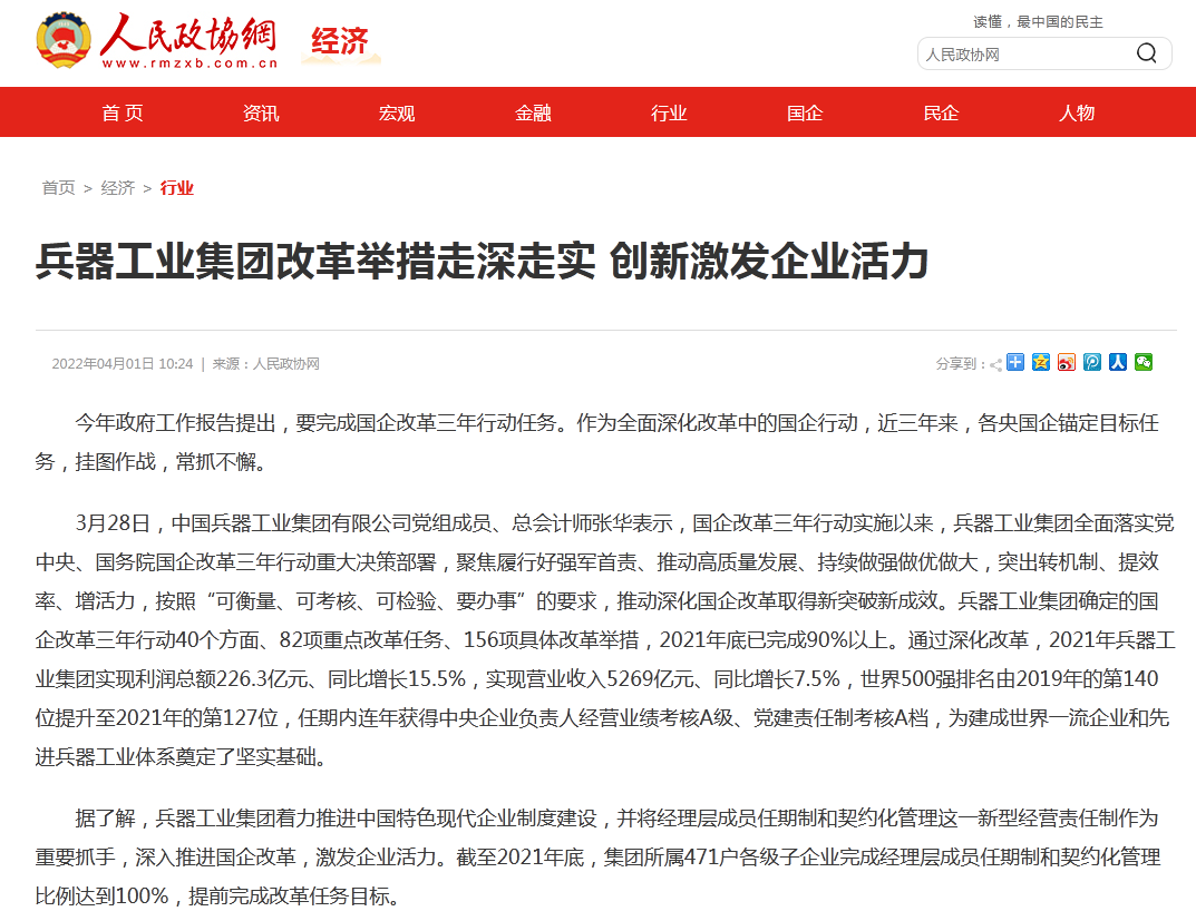 兵器工業(yè)集團(tuán)國企改革三年行動工作成效引發(fā)廣泛關(guān)注丨國企改革看兵器 |