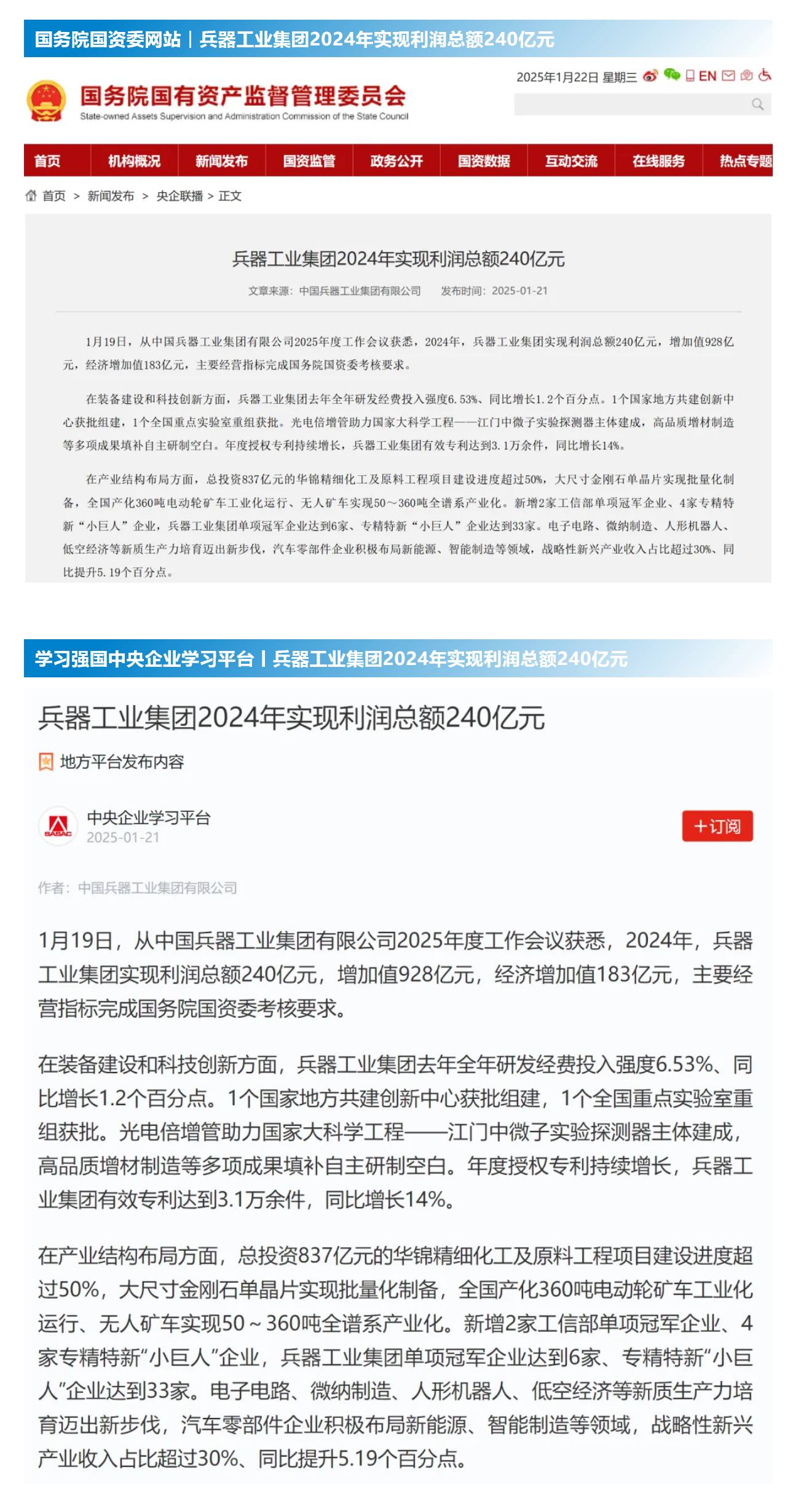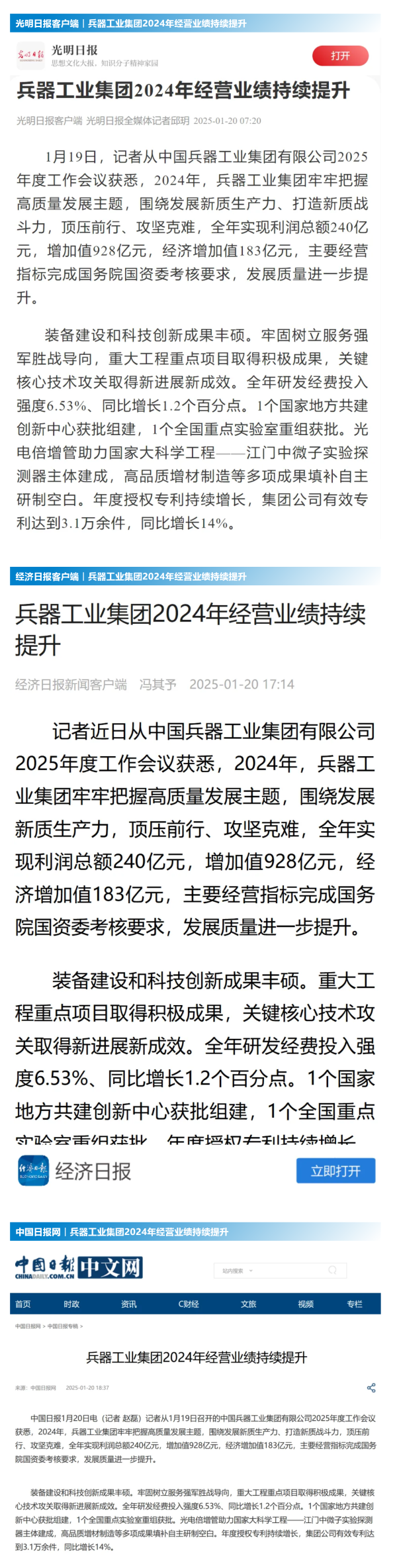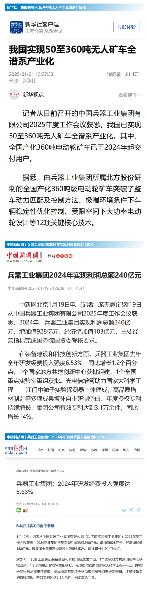 1月19日至20日,中國兵器工業(yè)集團有限公司2025年度工作會議在京召開,會議總結(jié)2024年工作,分析形勢任務(wù),明確工作思路,部署2025年工作。 集團公司2024年取得的成績及下一步重點工作受到社會媒體廣泛關(guān)注。新華社、中國新聞網(wǎng)、中國科技網(wǎng)、光明日報客戶端、經(jīng)濟日報客戶端、中國日報網(wǎng)、國務(wù)院國資委網(wǎng)站、學(xué)習(xí)強國中央企業(yè)學(xué)習(xí)平臺、新浪網(wǎng)、網(wǎng)易網(wǎng)、搜狐網(wǎng)、騰訊網(wǎng)、鳳凰網(wǎng)等中央主流媒體、國家部委網(wǎng)站及知名網(wǎng)絡(luò)媒體對集團公司2025年度工作會議進行了報道,重點關(guān)注集團公司經(jīng)營業(yè)績、科技創(chuàng)新、產(chǎn)業(yè)結(jié)構(gòu)布局優(yōu)化等情況。其中,新華社以《我國實現(xiàn)50至360噸無人礦車全譜系產(chǎn)業(yè)化》為題,重點報道了集團公司在推動智能制造水平提升方面取得的成效;中國新聞網(wǎng)、光明日報客戶端、經(jīng)濟日報客戶端、中國日報網(wǎng)等就集團公司2024年度經(jīng)營業(yè)績及各項工作取得的成果進行報道;中國科技網(wǎng)著重報道了集團公司在科技創(chuàng)新和優(yōu)化產(chǎn)業(yè)結(jié)構(gòu)布局方面的最新進展。集團公司門戶網(wǎng)站、微信公眾號、微博等新媒體平臺以及《中國兵工報》也對集團公司工作會議進行了及時報道,各成員單位紛紛對相關(guān)內(nèi)容進行轉(zhuǎn)載,引發(fā)全系統(tǒng)關(guān)注。 集團公司職工及廣大網(wǎng)友熱議工作會 “2025年工作會為我們指明了發(fā)展方向、明確了奮斗目標(biāo),面對全新的機遇和挑戰(zhàn),作為兵工人深感責(zé)任重大?!?/p> “科技是第一生產(chǎn)力,一定要以科技創(chuàng)新引領(lǐng)新質(zhì)生產(chǎn)力發(fā)展,為高質(zhì)量發(fā)展提供支撐?!?/p> “把各項工作做深、做實、做細(xì),努力為集團公司高質(zhì)量發(fā)展添磚加瓦。” “2024年中國兵器展示了大國重器,祝新的一年中再創(chuàng)輝煌!” |